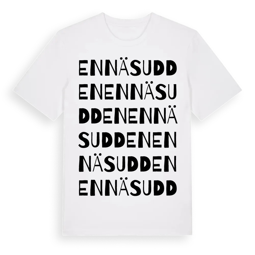 Ennäsudden ordlek t-shirt är inspirerad av Ennäsudden i Stockholms län, Sverige. Tröjan är designad för dig som har en speciell koppling till platsen – oavsett om du bor här, har rötterna här eller bara älskar Ennäsudden.