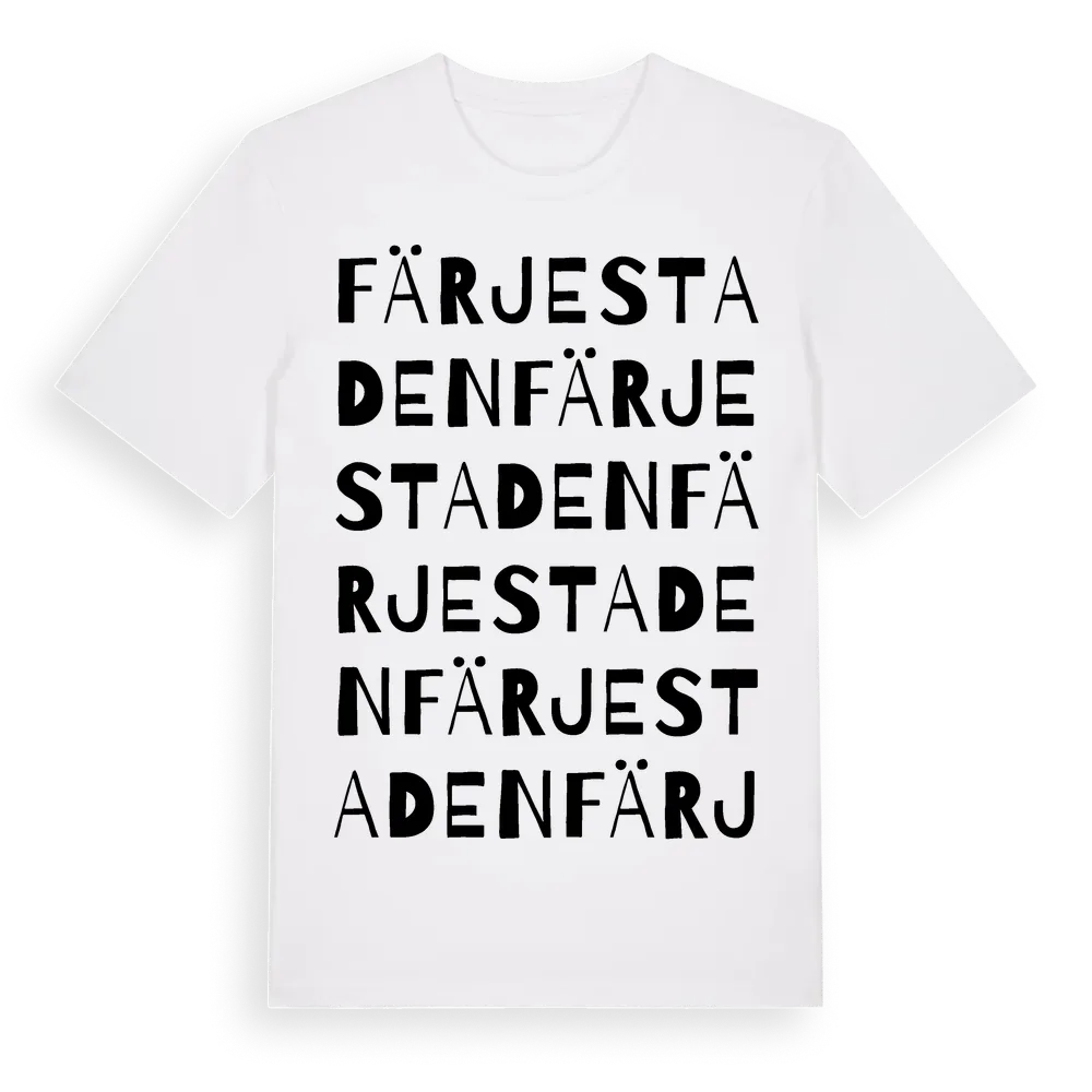 Färjestaden ordlek t-shirt är inspirerad av Färjestaden i Stockholms län, Sverige. Tröjan är designad för dig som har en speciell koppling till platsen – oavsett om du bor här, har rötterna här eller bara älskar Färjestaden.