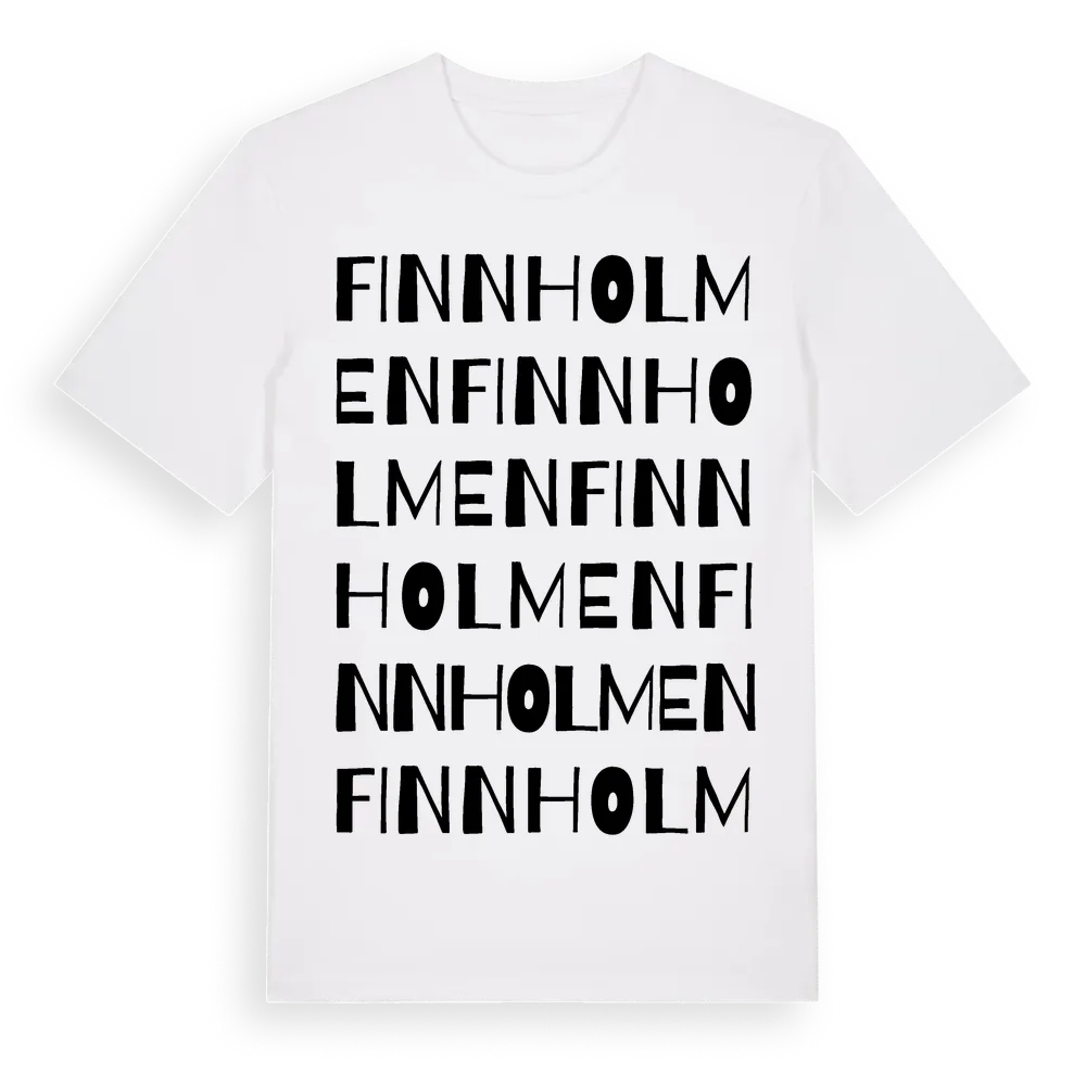 Finnholmen ordlek t-shirt är inspirerad av byn Finnholmen i Stockholms län, Sverige. Tröjan är designad för dig som har en speciell koppling till platsen – oavsett om du bor här, har rötterna här eller bara älskar Finnholmen.