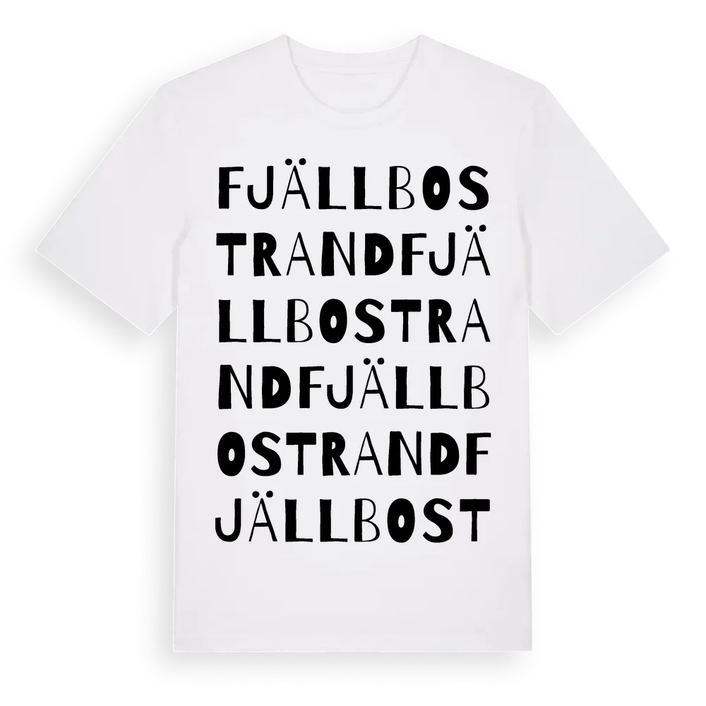 Fjällbostrand ordlek t-shirt är inspirerad av byn Fjällbostrand i Stockholms län, Sverige. Tröjan är designad för dig som har en speciell koppling till platsen – oavsett om du bor här, har rötterna här eller bara älskar Fjällbostrand.