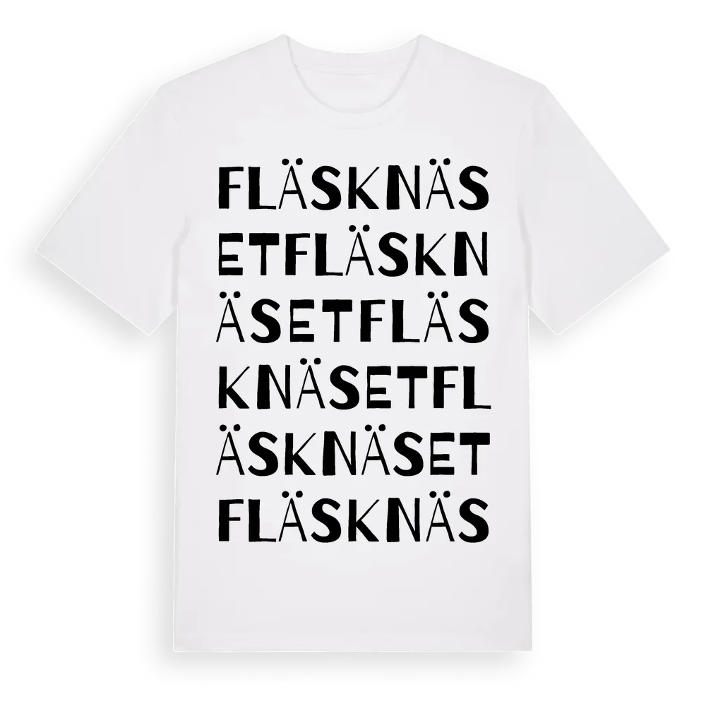 Fläsknäset ordlek t-shirt är inspirerad av stadsdelen Fläsknäset i Stockholms län, Sverige. Tröjan är designad för dig som har en speciell koppling till platsen – oavsett om du bor här, har rötterna här eller bara älskar Fläsknäset.