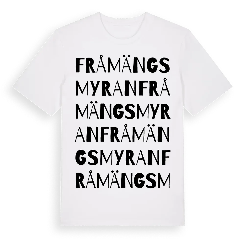 Fråmängsmyran ordlek t-shirt är inspirerad av Fråmängsmyran i Stockholms län, Sverige. Tröjan är designad för dig som har en speciell koppling till platsen – oavsett om du bor här, har rötterna här eller bara älskar Fråmängsmyran.