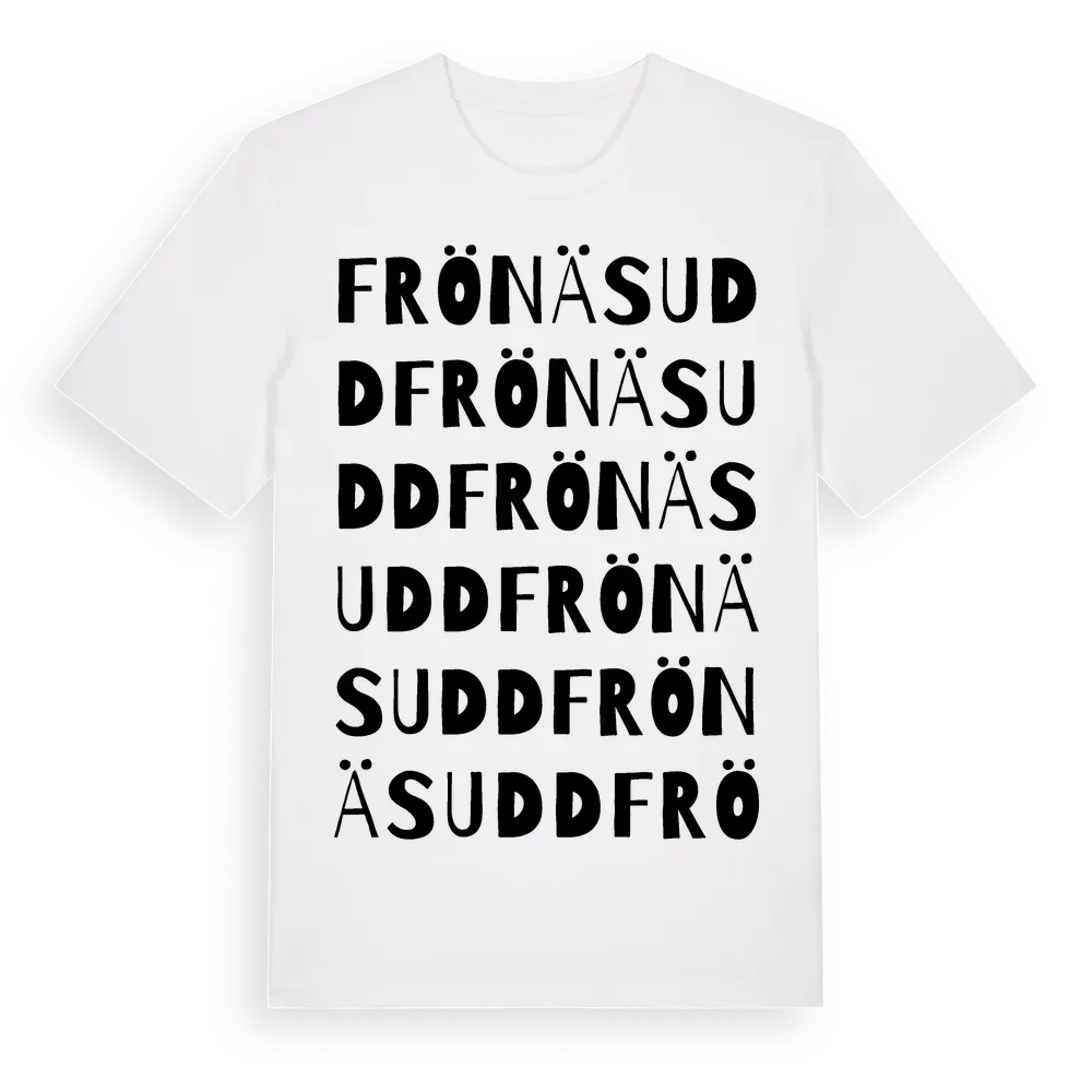 Frönäsudd ordlek t-shirt är inspirerad av Frönäsudd i Stockholms län, Sverige. Tröjan är designad för dig som har en speciell koppling till platsen – oavsett om du bor här, har rötterna här eller bara älskar Frönäsudd.