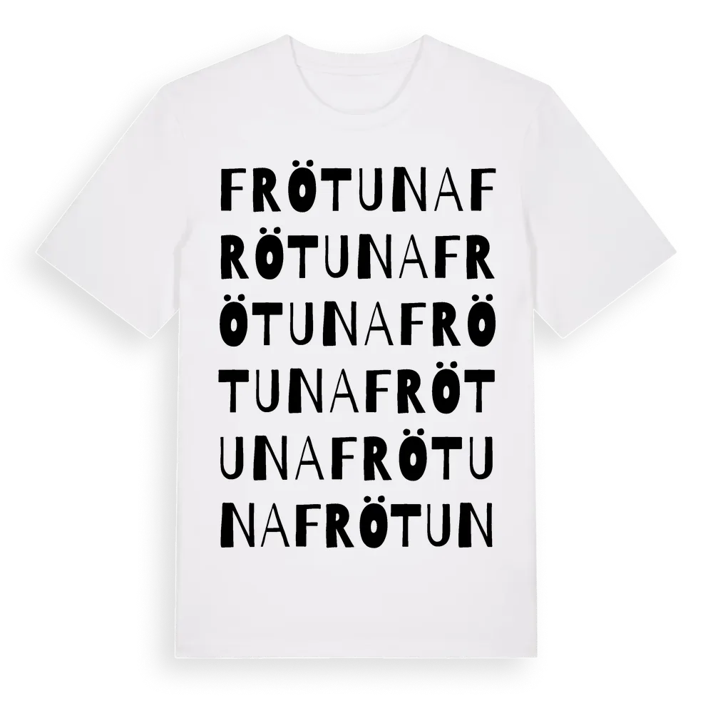 Frötuna ordlek t-shirt är inspirerad av Frötuna i Stockholms län, Sverige. Tröjan är designad för dig som har en speciell koppling till platsen – oavsett om du bor här, har rötterna här eller bara älskar Frötuna.