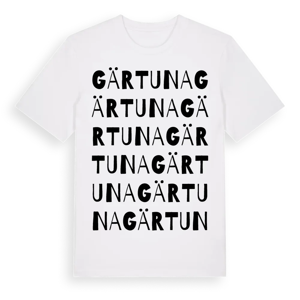 Gärtuna ordlek t-shirt är inspirerad av byn Gärtuna i Stockholms län, Sverige. Tröjan är designad för dig som har en speciell koppling till platsen – oavsett om du bor här, har rötterna här eller bara älskar Gärtuna.