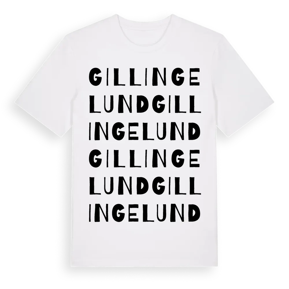 Gillingelund ordlek t-shirt är inspirerad av Gillingelund i Stockholms län, Sverige. Tröjan är designad för dig som har en speciell koppling till platsen – oavsett om du bor här, har rötterna här eller bara älskar Gillingelund.