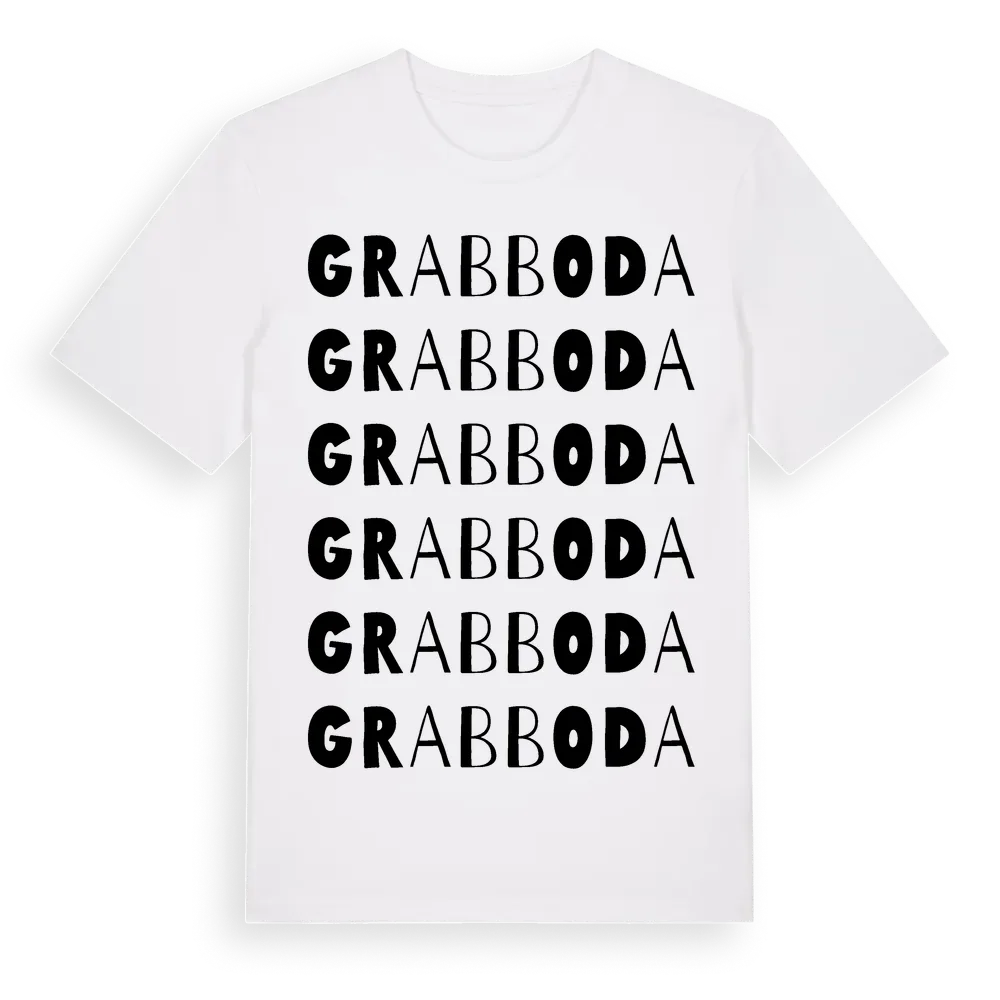 En ordlek byggd på Grabbodas namn. Subtilt och klurig – ett motiv som bara de som verkligen känner platsen fullt ut förstår. Premium bomull, unisex – från Grabboda i Stockholms län.