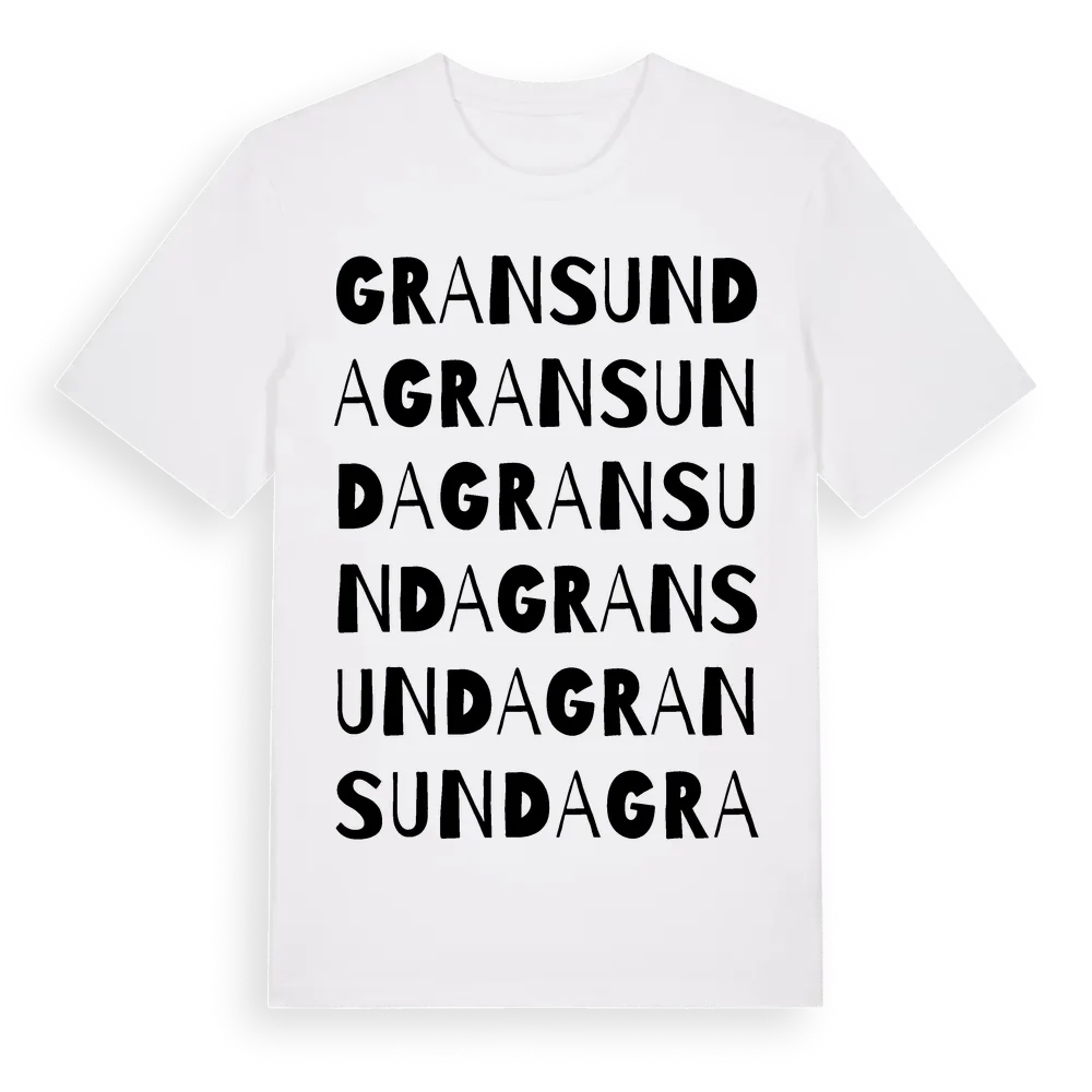 En ordlek byggd på Gransundas namn. Subtilt och klurig – ett motiv som bara de som verkligen känner platsen fullt ut förstår. Premium bomull, unisex – från Gransunda i Stockholms län.