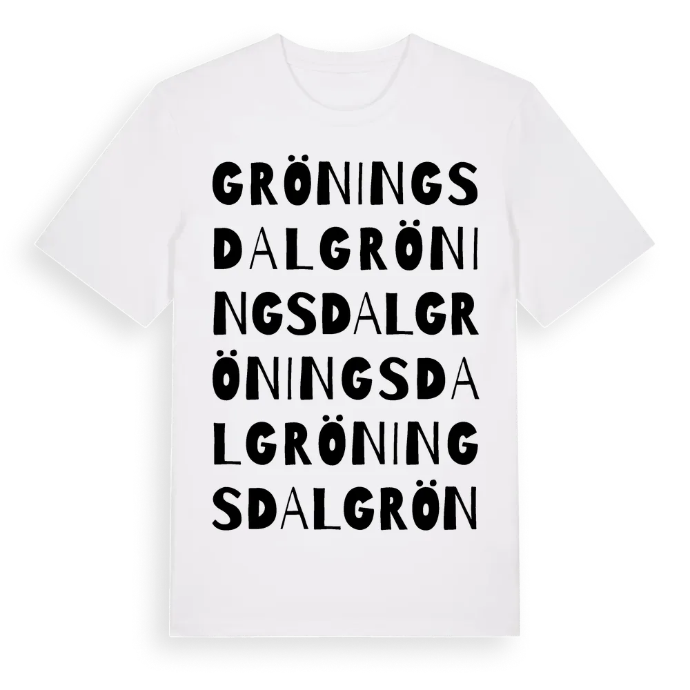 Gröningsdal ordlek t-shirt är inspirerad av Gröningsdal i Stockholms län, Sverige. Tröjan är designad för dig som har en speciell koppling till platsen – oavsett om du bor här, har rötterna här eller bara älskar Gröningsdal.