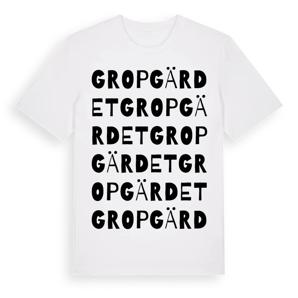 Gropgärdet ordlek t-shirt är inspirerad av stadsdelen Gropgärdet i Stockholms län, Sverige. Tröjan är designad för dig som har en speciell koppling till platsen – oavsett om du bor här, har rötterna här eller bara älskar Gropgärdet.