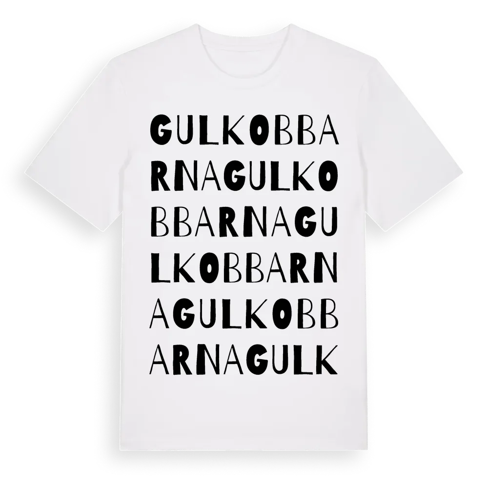Gulkobbarna ordlek t-shirt är inspirerad av Gulkobbarna i Stockholms län, Sverige. Tröjan är designad för dig som har en speciell koppling till platsen – oavsett om du bor här, har rötterna här eller bara älskar Gulkobbarna.