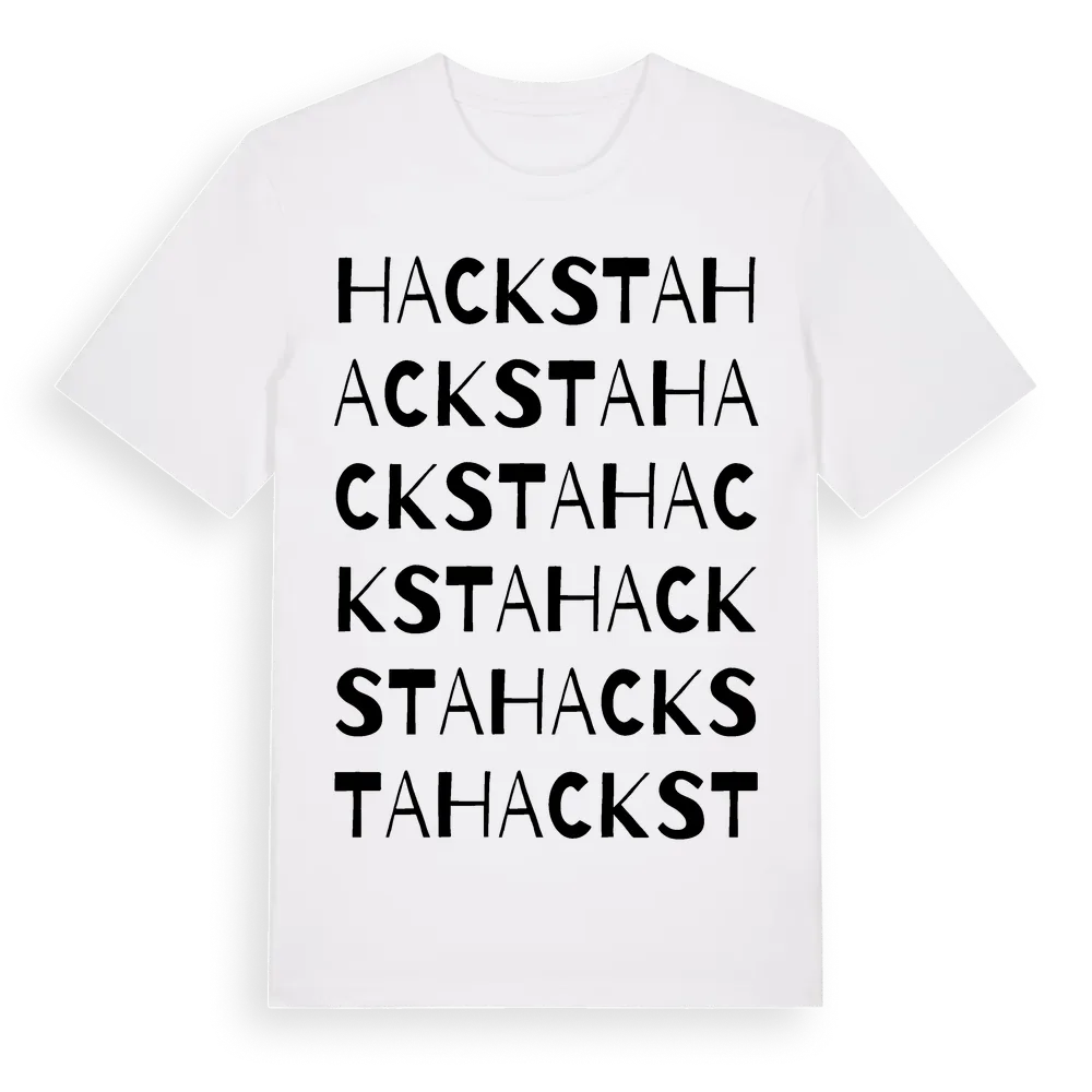 En ordlek byggd på Hackstas namn. Subtilt och klurig – ett motiv som bara de som verkligen känner platsen fullt ut förstår. Premium bomull, unisex – från stadsdelen Hacksta i Stockholms län.