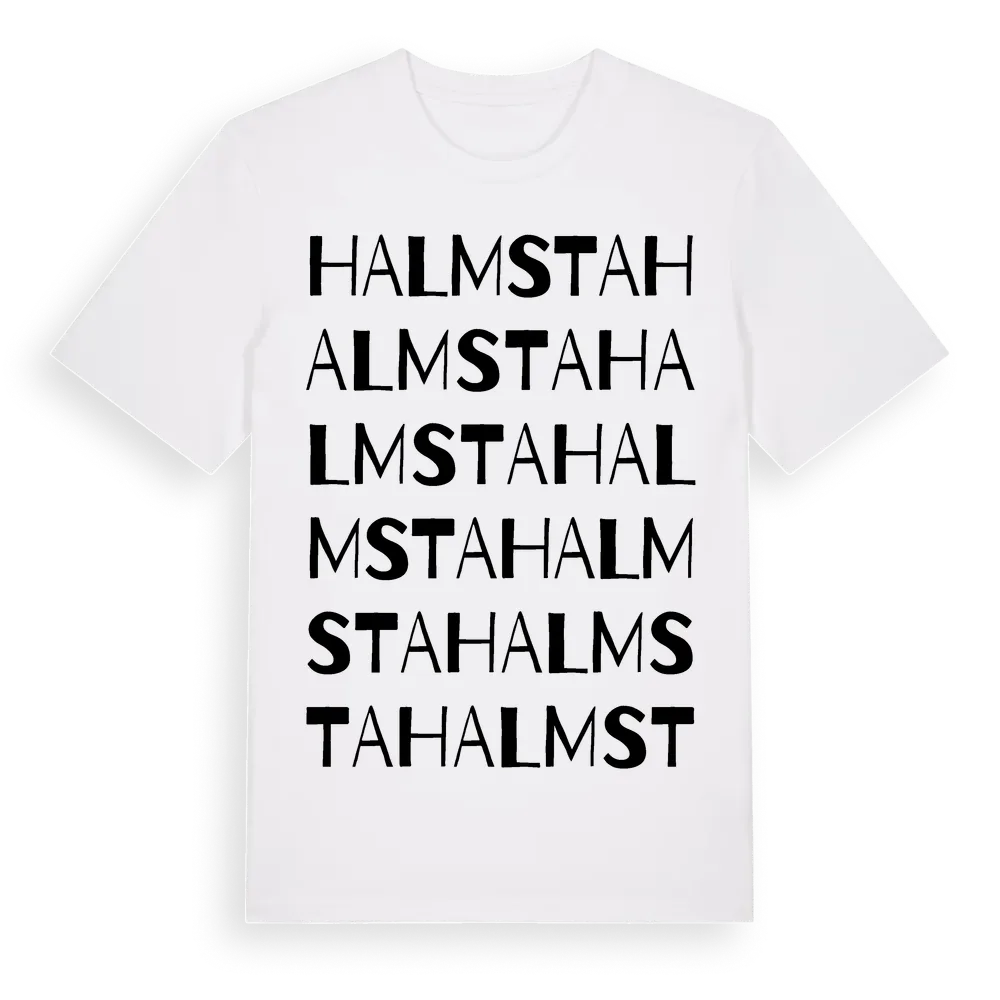 Halmsta ordlek t-shirt är inspirerad av Halmsta i Stockholms län, Sverige. Tröjan är designad för dig som har en speciell koppling till platsen – oavsett om du bor här, har rötterna här eller bara älskar Halmsta.