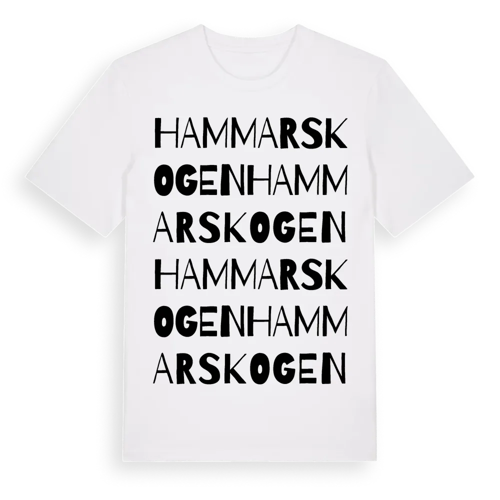 Hammarskogen ordlek t-shirt är inspirerad av byn Hammarskogen i Stockholms län, Sverige. Tröjan är designad för dig som har en speciell koppling till platsen – oavsett om du bor här, har rötterna här eller bara älskar Hammarskogen.
