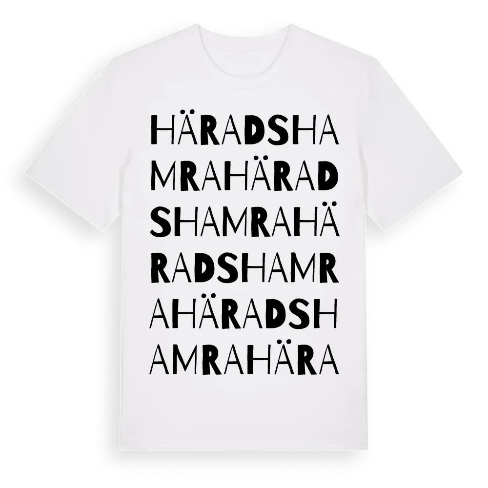Häradshamra ordlek t-shirt är inspirerad av Häradshamra i Stockholms län, Sverige. Tröjan är designad för dig som har en speciell koppling till platsen – oavsett om du bor här, har rötterna här eller bara älskar Häradshamra.
