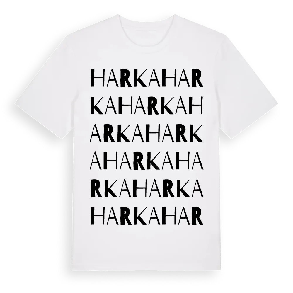 Harka ordlek t-shirt är inspirerad av byn Harka i Stockholms län, Sverige. Tröjan är designad för dig som har en speciell koppling till platsen – oavsett om du bor här, har rötterna här eller bara älskar Harka.