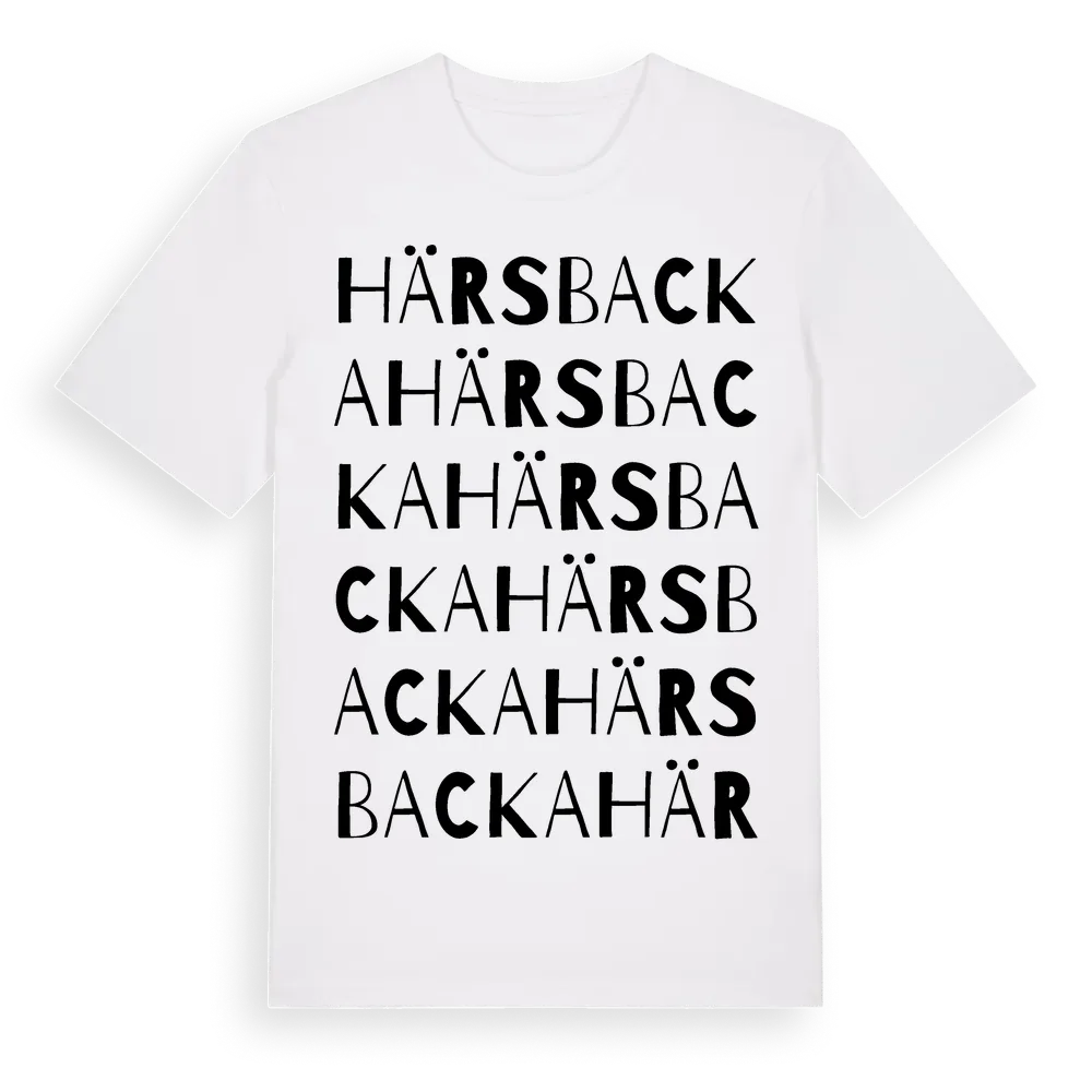 Härsbacka ordlek t-shirt är inspirerad av stadsdelen Härsbacka i Stockholms län, Sverige. Tröjan är designad för dig som har en speciell koppling till platsen – oavsett om du bor här, har rötterna här eller bara älskar Härsbacka.