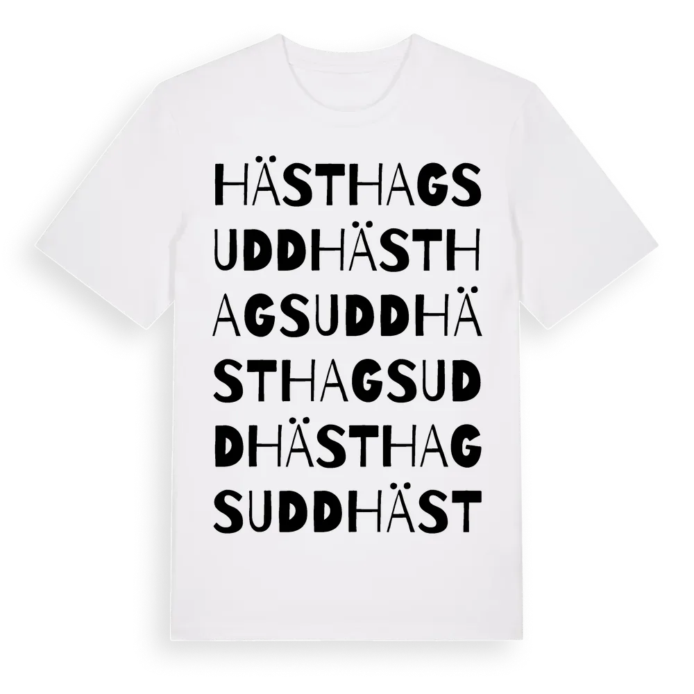 Hästhagsudd ordlek t-shirt är inspirerad av Hästhagsudd i Stockholms län, Sverige. Tröjan är designad för dig som har en speciell koppling till platsen – oavsett om du bor här, har rötterna här eller bara älskar Hästhagsudd.