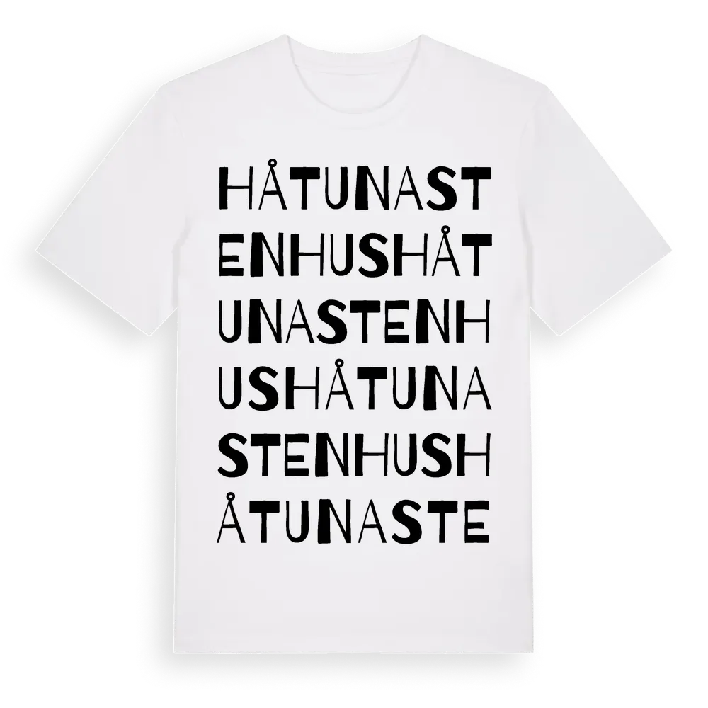 Håtuna Stenhus ordlek t-shirt är inspirerad av byn Håtuna Stenhus i Stockholms län, Sverige. Tröjan är designad för dig som har en speciell koppling till platsen – oavsett om du bor här, har rötterna här eller bara älskar Håtuna Stenhus.