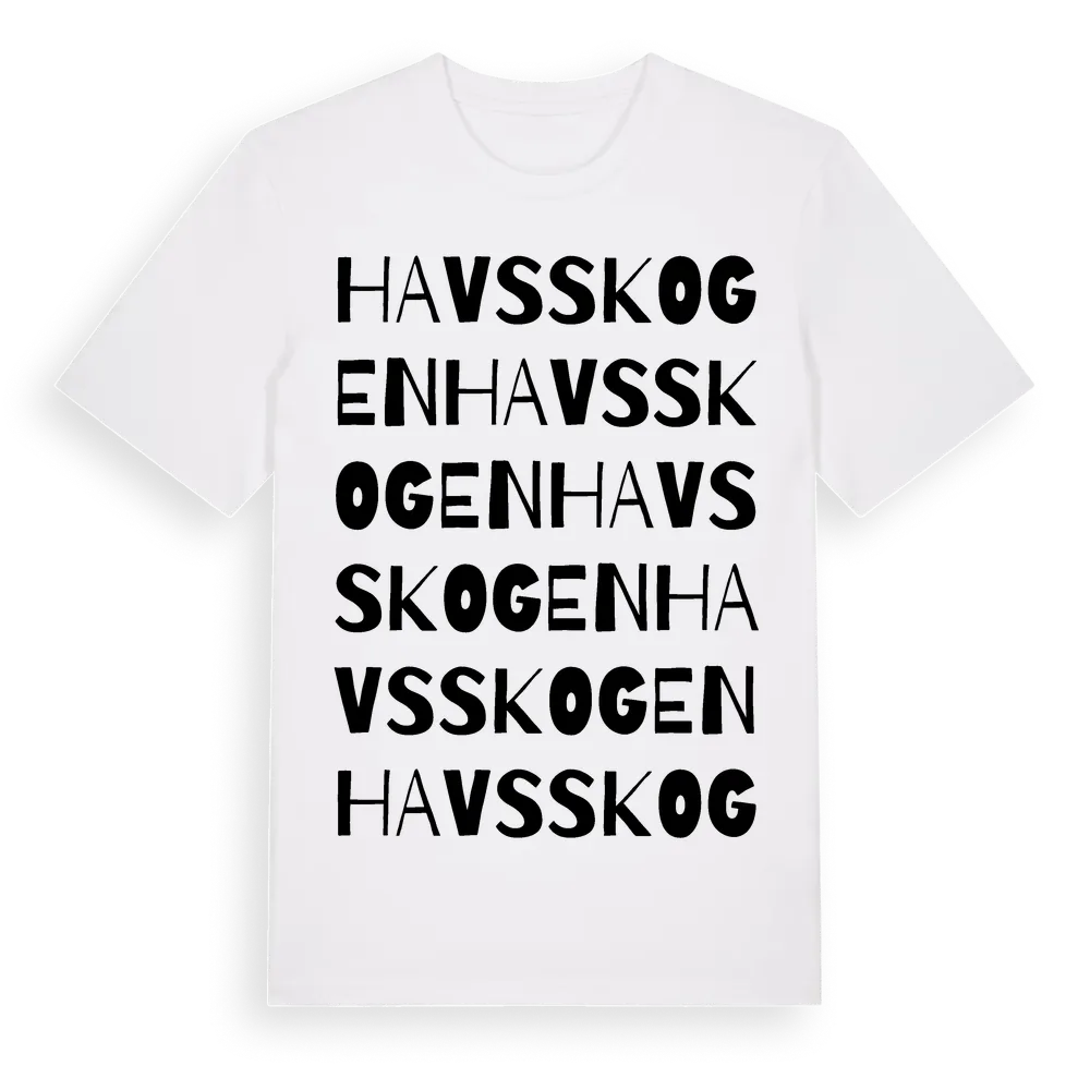 Havsskogen ordlek t-shirt är inspirerad av byn Havsskogen i Stockholms län, Sverige. Tröjan är designad för dig som har en speciell koppling till platsen – oavsett om du bor här, har rötterna här eller bara älskar Havsskogen.