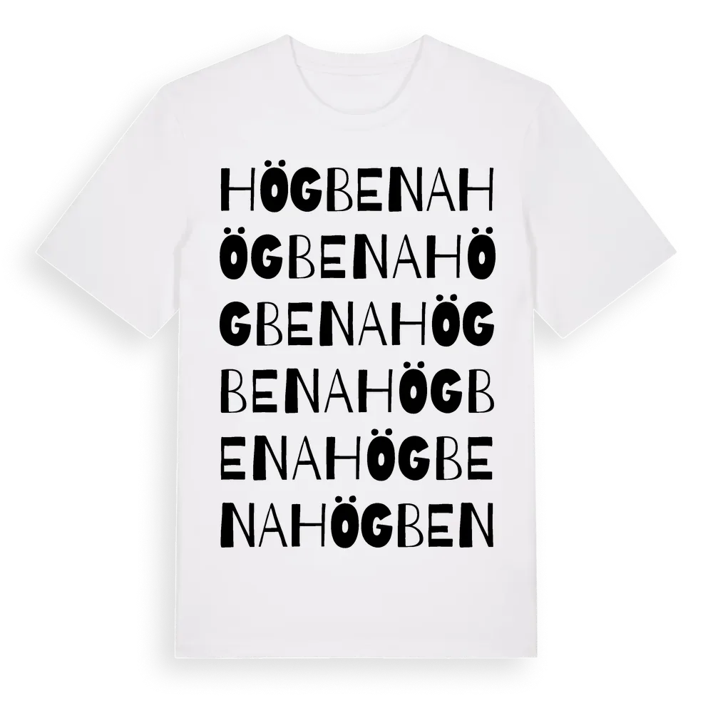 Högbena ordlek t-shirt är inspirerad av byn Högbena i Stockholms län, Sverige. Tröjan är designad för dig som har en speciell koppling till platsen – oavsett om du bor här, har rötterna här eller bara älskar Högbena.