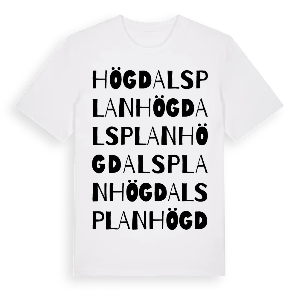 Högdalsplan ordlek t-shirt är inspirerad av Högdalsplan i Stockholms län, Sverige. Tröjan är designad för dig som har en speciell koppling till platsen – oavsett om du bor här, har rötterna här eller bara älskar Högdalsplan.