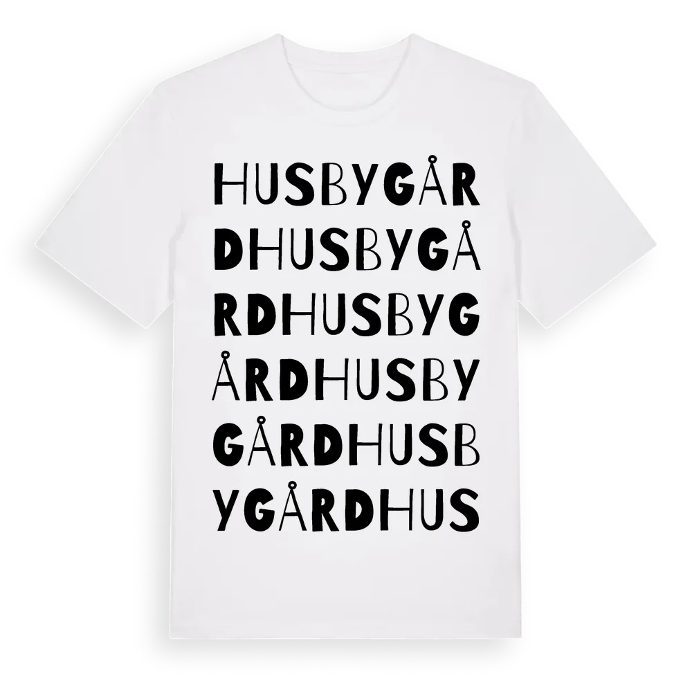 Husby Gård ordlek t-shirt är inspirerad av Husby Gård i Stockholms län, Sverige. Tröjan är designad för dig som har en speciell koppling till platsen – oavsett om du bor här, har rötterna här eller bara älskar Husby Gård.
