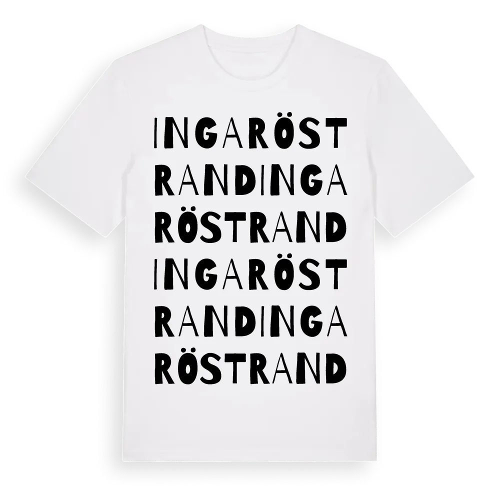 Ingaröstrand ordlek t-shirt är inspirerad av byn Ingaröstrand i Stockholms län, Sverige. Tröjan är designad för dig som har en speciell koppling till platsen – oavsett om du bor här, har rötterna här eller bara älskar Ingaröstrand.