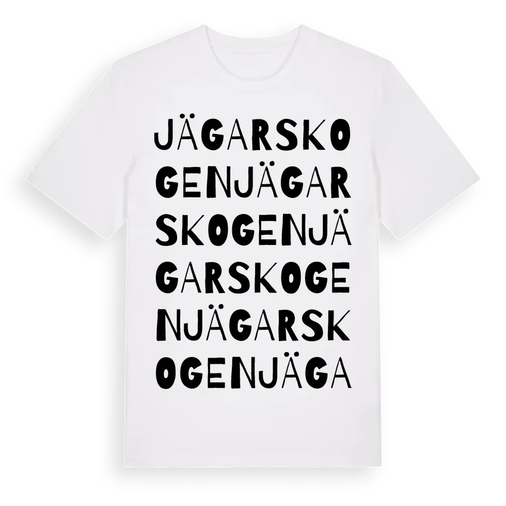 Jägarskogen ordlek t-shirt är inspirerad av Jägarskogen i Stockholms län, Sverige. Tröjan är designad för dig som har en speciell koppling till platsen – oavsett om du bor här, har rötterna här eller bara älskar Jägarskogen.