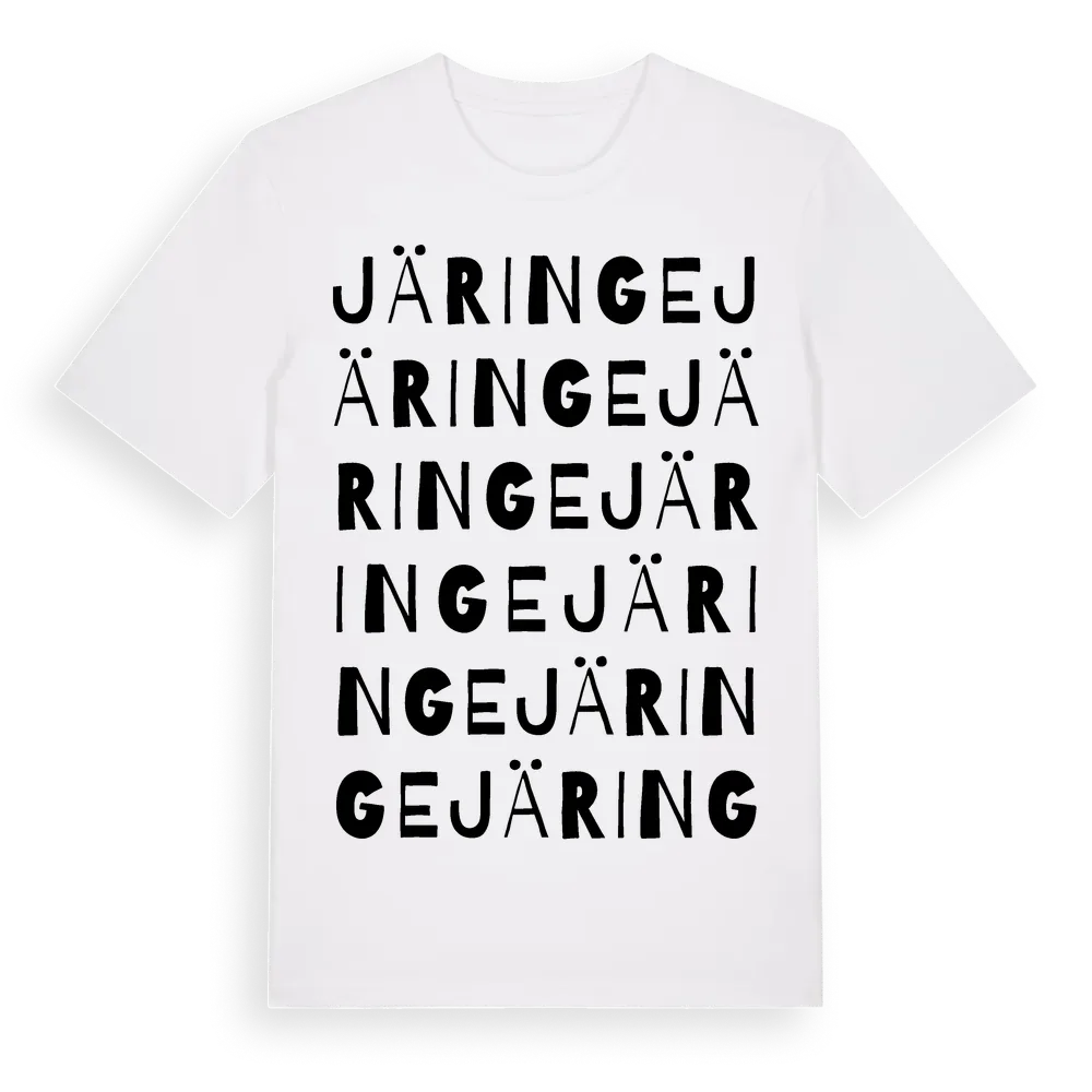 En ordlek byggd på Järinges namn. Subtilt och klurig – ett motiv som bara de som verkligen känner platsen fullt ut förstår. Premium bomull, unisex – från Järinge i Stockholms län.