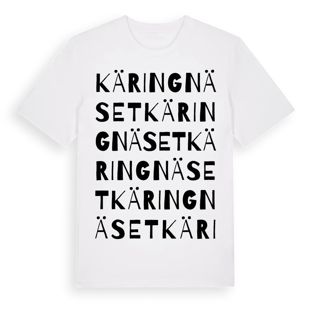 Käringnäset ordlek t-shirt är inspirerad av byn Käringnäset i Stockholms län, Sverige. Tröjan är designad för dig som har en speciell koppling till platsen – oavsett om du bor här, har rötterna här eller bara älskar Käringnäset.