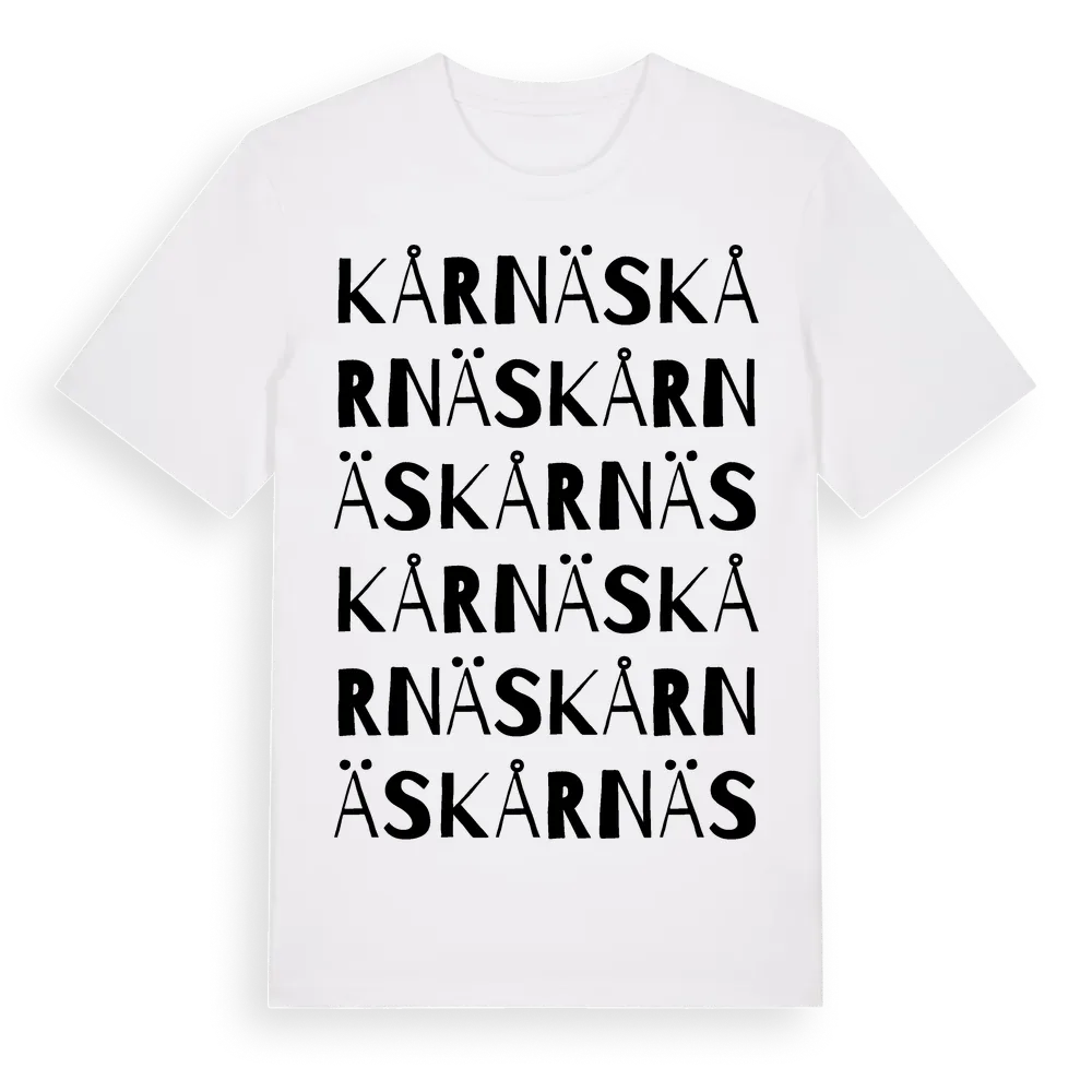 Kårnäs ordlek t-shirt är inspirerad av byn Kårnäs i Stockholms län, Sverige. Tröjan är designad för dig som har en speciell koppling till platsen – oavsett om du bor här, har rötterna här eller bara älskar Kårnäs.