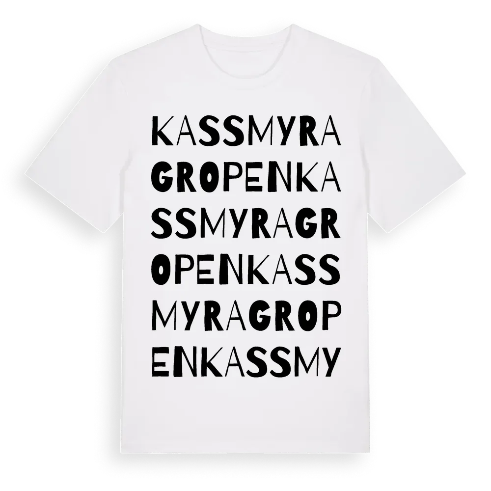 Kassmyragropen ordlek t-shirt är inspirerad av Kassmyragropen i Stockholms län, Sverige. Tröjan är designad för dig som har en speciell koppling till platsen – oavsett om du bor här, har rötterna här eller bara älskar Kassmyragropen.