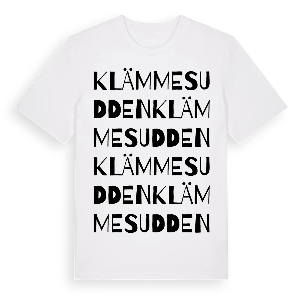 Klämmesudden ordlek t-shirt är inspirerad av byn Klämmesudden i Stockholms län, Sverige. Tröjan är designad för dig som har en speciell koppling till platsen – oavsett om du bor här, har rötterna här eller bara älskar Klämmesudden.