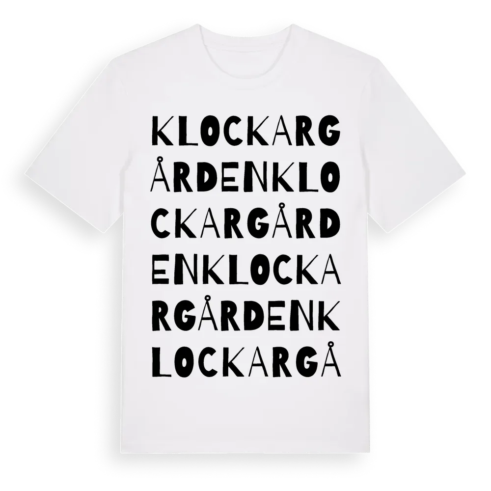 Klockargården ordlek t-shirt är inspirerad av Klockargården i Stockholms län, Sverige. Tröjan är designad för dig som har en speciell koppling till platsen – oavsett om du bor här, har rötterna här eller bara älskar Klockargården.