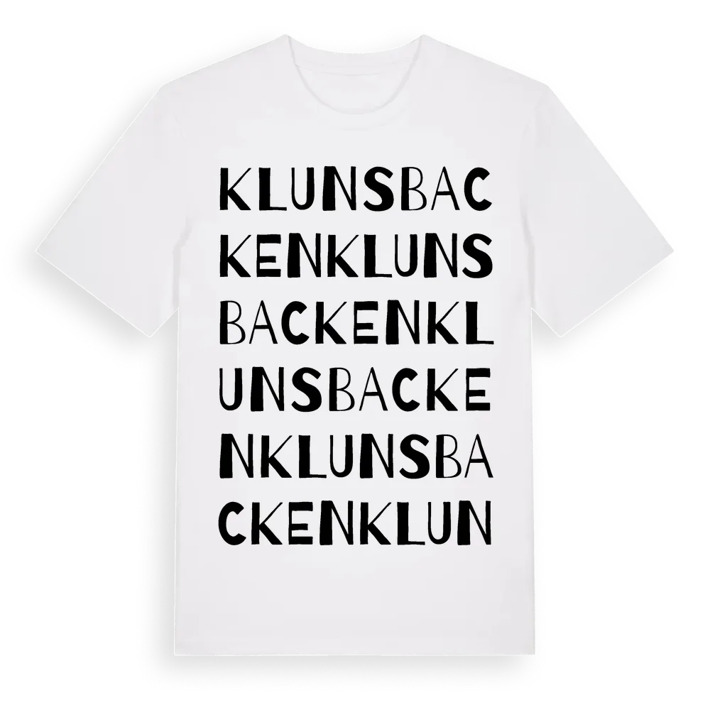 Klunsbacken ordlek t-shirt är inspirerad av Klunsbacken i Stockholms län, Sverige. Tröjan är designad för dig som har en speciell koppling till platsen – oavsett om du bor här, har rötterna här eller bara älskar Klunsbacken.