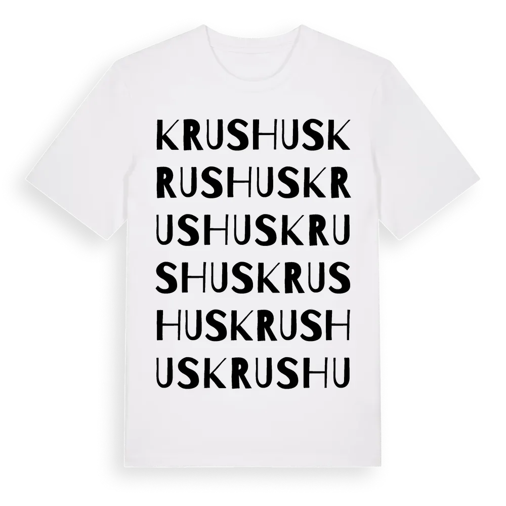 Krushus ordlek t-shirt är inspirerad av Krushus i Stockholms län, Sverige. Tröjan är designad för dig som har en speciell koppling till platsen – oavsett om du bor här, har rötterna här eller bara älskar Krushus.