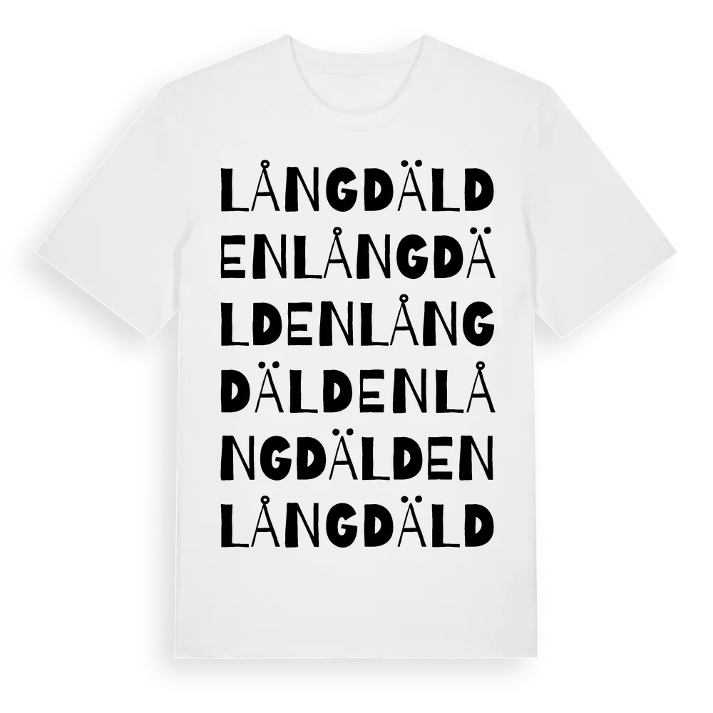 Långdälden ordlek t-shirt är inspirerad av Långdälden i Stockholms län, Sverige. Tröjan är designad för dig som har en speciell koppling till platsen – oavsett om du bor här, har rötterna här eller bara älskar Långdälden.