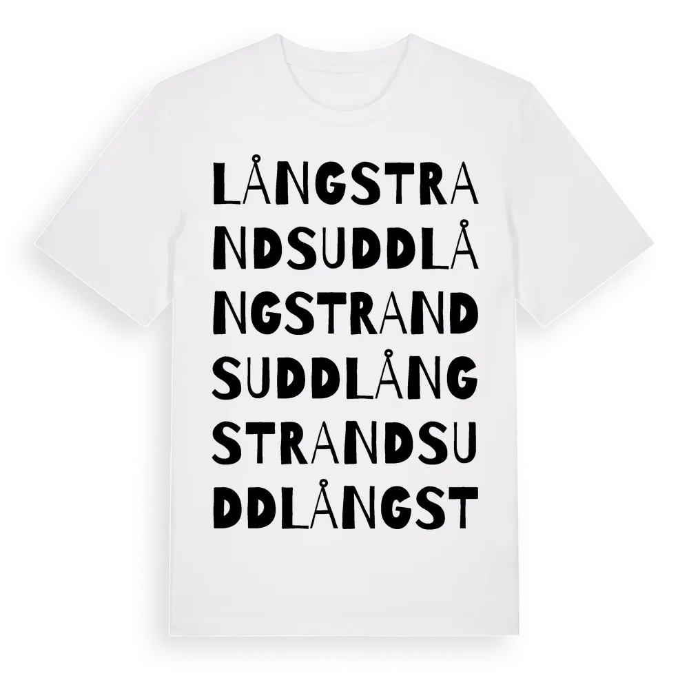 Långstrandsudd ordlek t-shirt är inspirerad av byn Långstrandsudd i Stockholms län, Sverige. Tröjan är designad för dig som har en speciell koppling till platsen – oavsett om du bor här, har rötterna här eller bara älskar Långstrandsudd.