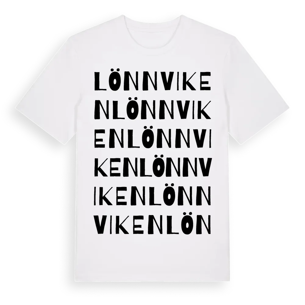 Lönnviken ordlek t-shirt är inspirerad av Lönnviken i Stockholms län, Sverige. Tröjan är designad för dig som har en speciell koppling till platsen – oavsett om du bor här, har rötterna här eller bara älskar Lönnviken.