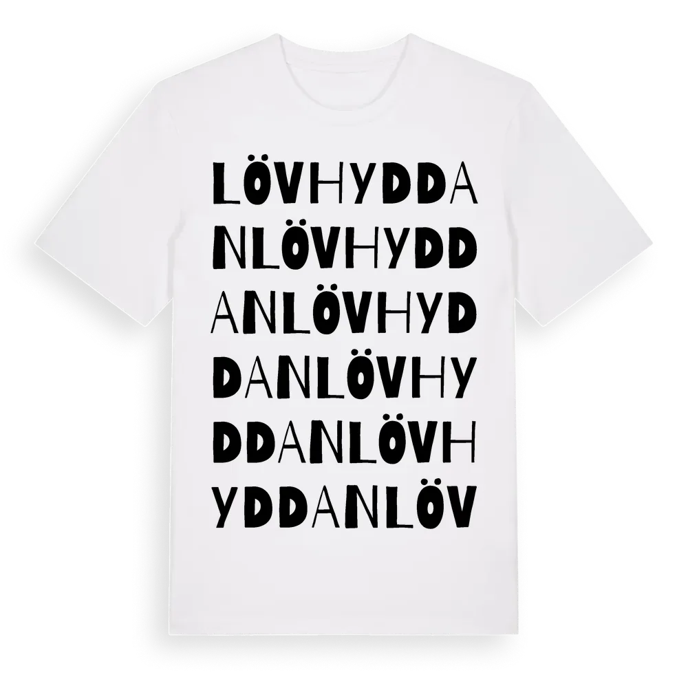 Lövhyddan ordlek t-shirt är inspirerad av Lövhyddan i Stockholms län, Sverige. Tröjan är designad för dig som har en speciell koppling till platsen – oavsett om du bor här, har rötterna här eller bara älskar Lövhyddan.