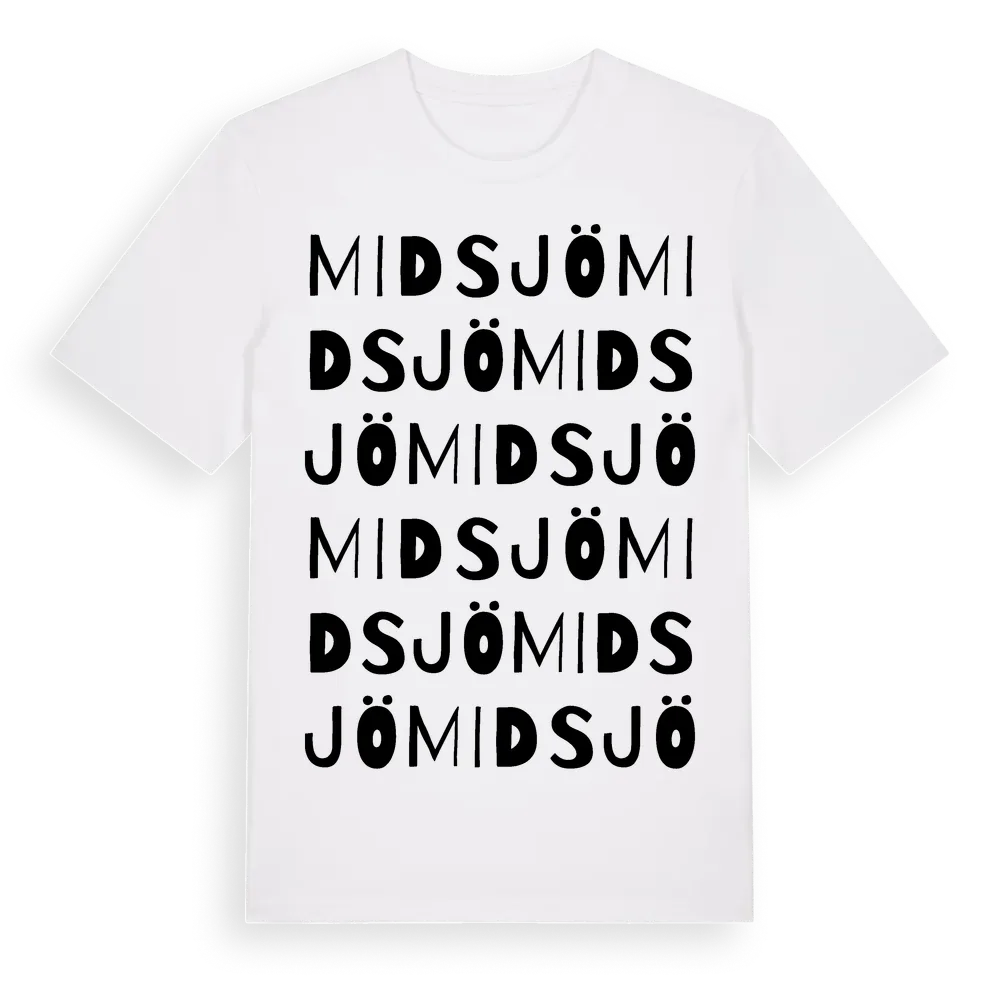 Midsjö ordlek t-shirt är inspirerad av Midsjö i Stockholms län, Sverige. Tröjan är designad för dig som har en speciell koppling till platsen – oavsett om du bor här, har rötterna här eller bara älskar Midsjö.