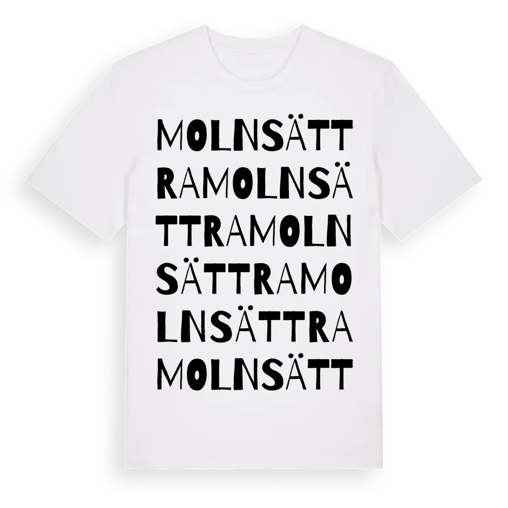 Molnsättra ordlek t-shirt är inspirerad av Molnsättra i Stockholms län, Sverige. Tröjan är designad för dig som har en speciell koppling till platsen – oavsett om du bor här, har rötterna här eller bara älskar Molnsättra.