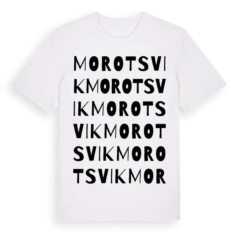 Morotsvik ordlek t-shirt är inspirerad av Morotsvik i Stockholms län, Sverige. Tröjan är designad för dig som har en speciell koppling till platsen – oavsett om du bor här, har rötterna här eller bara älskar Morotsvik.