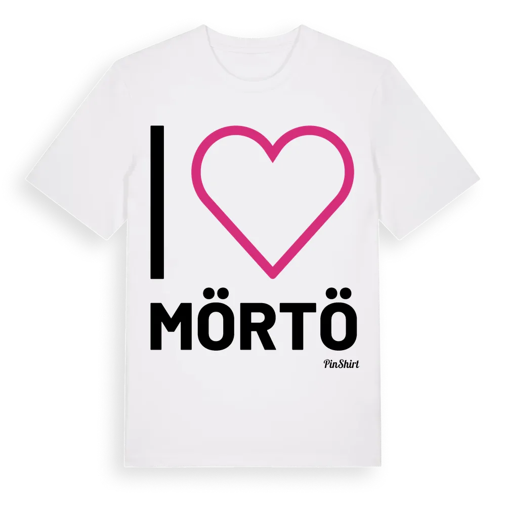 Jag älskar Mörtö t-shirt stort tryck är inspirerad av byn Mörtö i Stockholms län, Sverige. Tröjan är designad för dig som har en speciell koppling till platsen – oavsett om du bor här, har rötterna här eller bara älskar Mörtö.