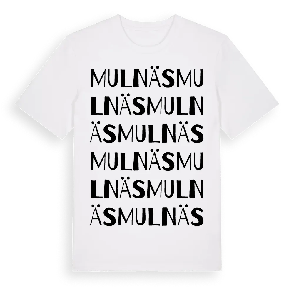 Mulnäs ordlek t-shirt är inspirerad av byn Mulnäs i Stockholms län, Sverige. Tröjan är designad för dig som har en speciell koppling till platsen – oavsett om du bor här, har rötterna här eller bara älskar Mulnäs.