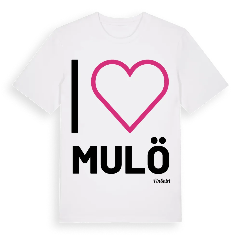 Det klassiska "I ❤ Mulö"-motivet i stort format som täcker hela bröstet. För dig som vill visa kärleken till Mulö på riktigt. Premium bomull, unisex – från byn Mulö i Stockholms län.