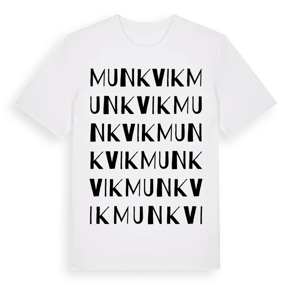 Munkvik ordlek t-shirt är inspirerad av Munkvik i Stockholms län, Sverige. Tröjan är designad för dig som har en speciell koppling till platsen – oavsett om du bor här, har rötterna här eller bara älskar Munkvik.