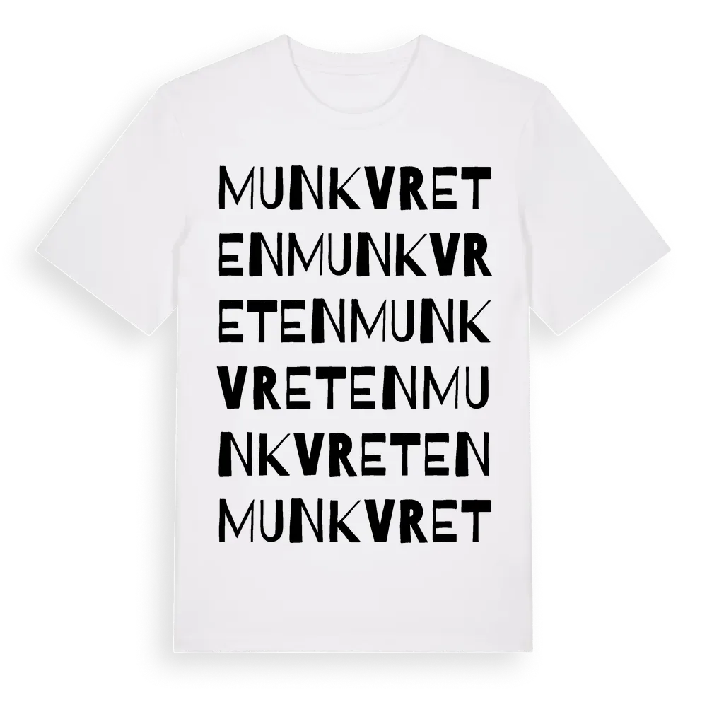 Munkvreten ordlek t-shirt är inspirerad av Munkvreten i Stockholms län, Sverige. Tröjan är designad för dig som har en speciell koppling till platsen – oavsett om du bor här, har rötterna här eller bara älskar Munkvreten.