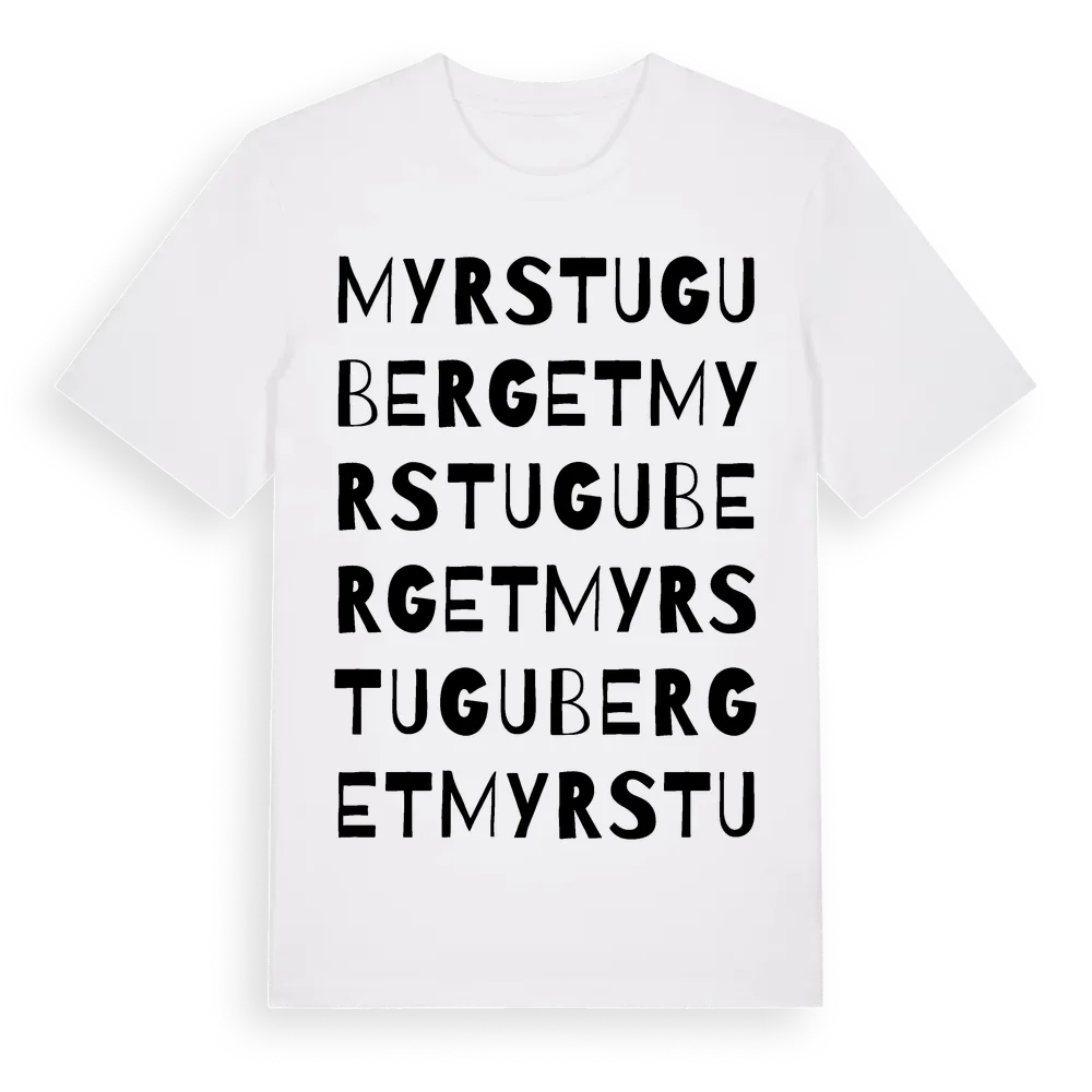 Myrstuguberget ordlek t-shirt är inspirerad av stadsdelen Myrstuguberget i Stockholms län, Sverige. Tröjan är designad för dig som har en speciell koppling till platsen – oavsett om du bor här, har rötterna här eller bara älskar Myrstuguberget.